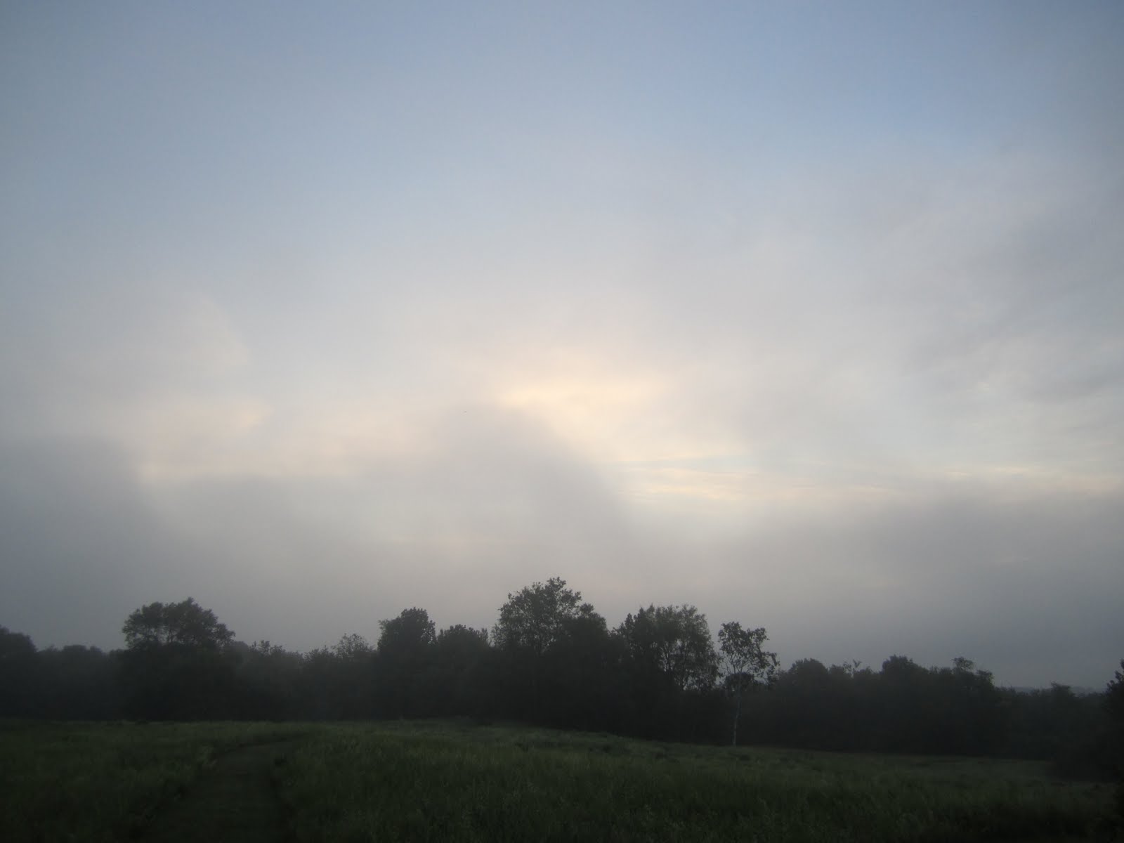 Ominous warnings hit me this morning in a cluster. There are some nesting blackbirds near the pond that set off the usual alarm when I walked by. One always threatens to dive bomb my head, but hasn't yet found the courage. On top of that, there was an extra loud barrage of trumpeting from the bullfrogs as I passed. As we entered the more open meadow, a long, slow, distant rumble of thunder curled across the sky.